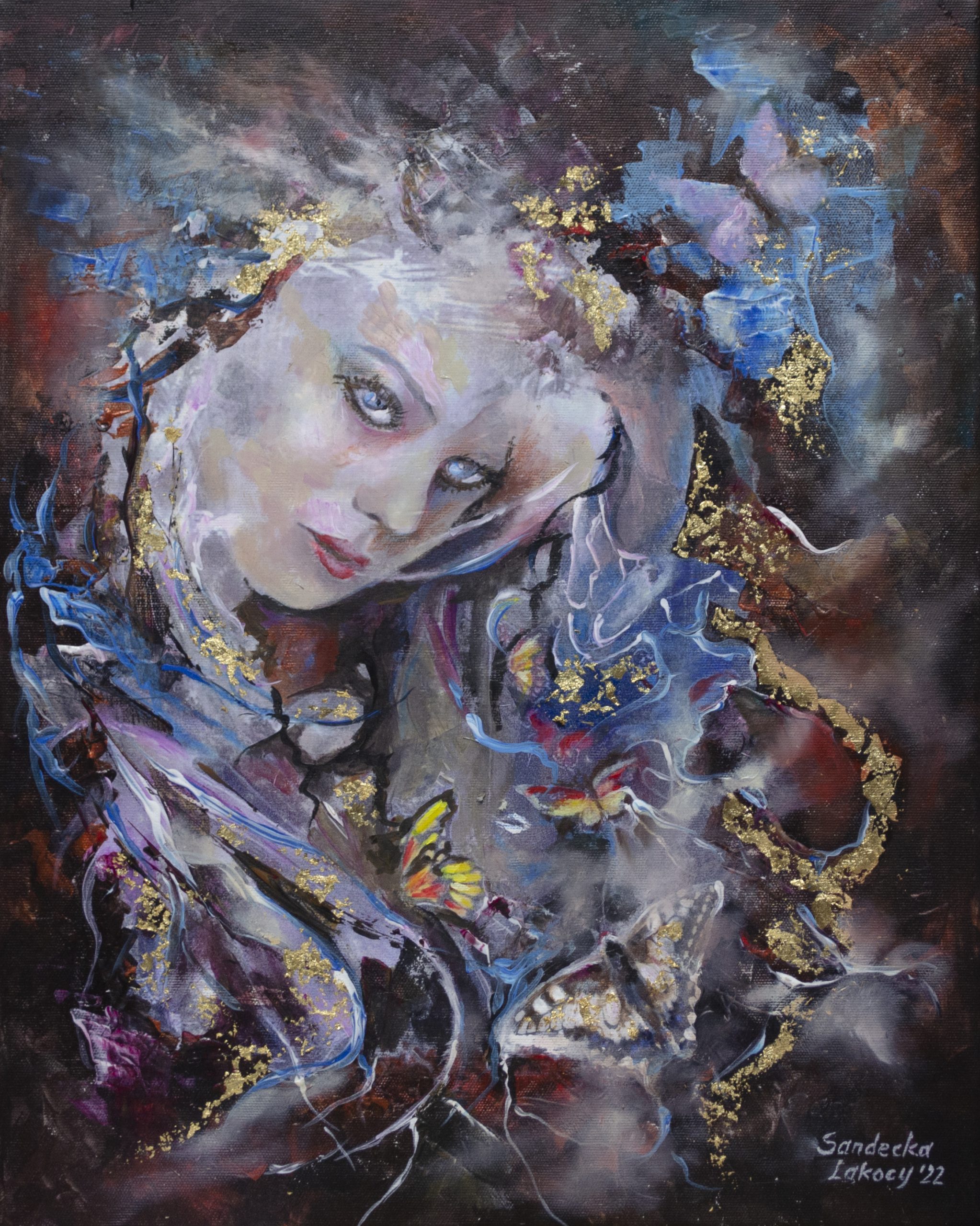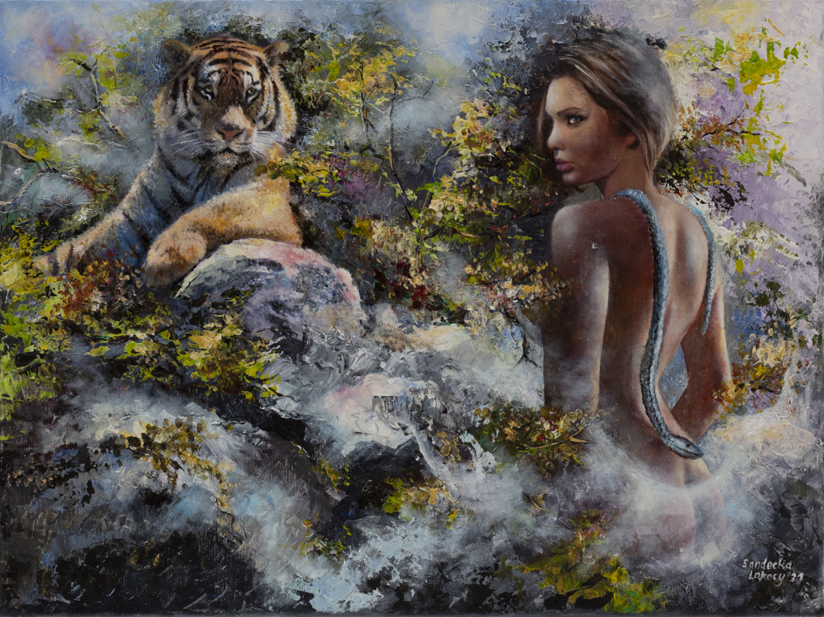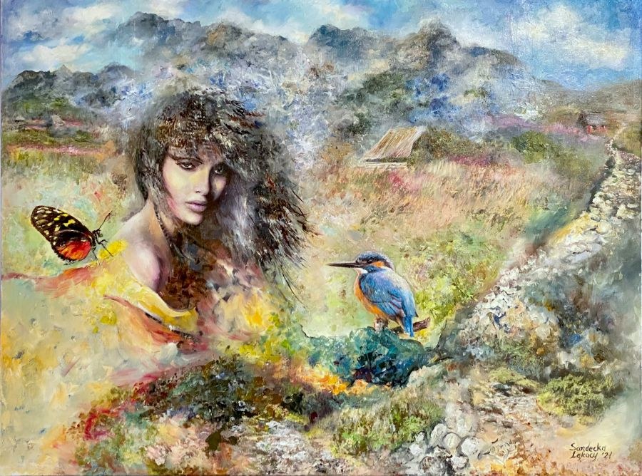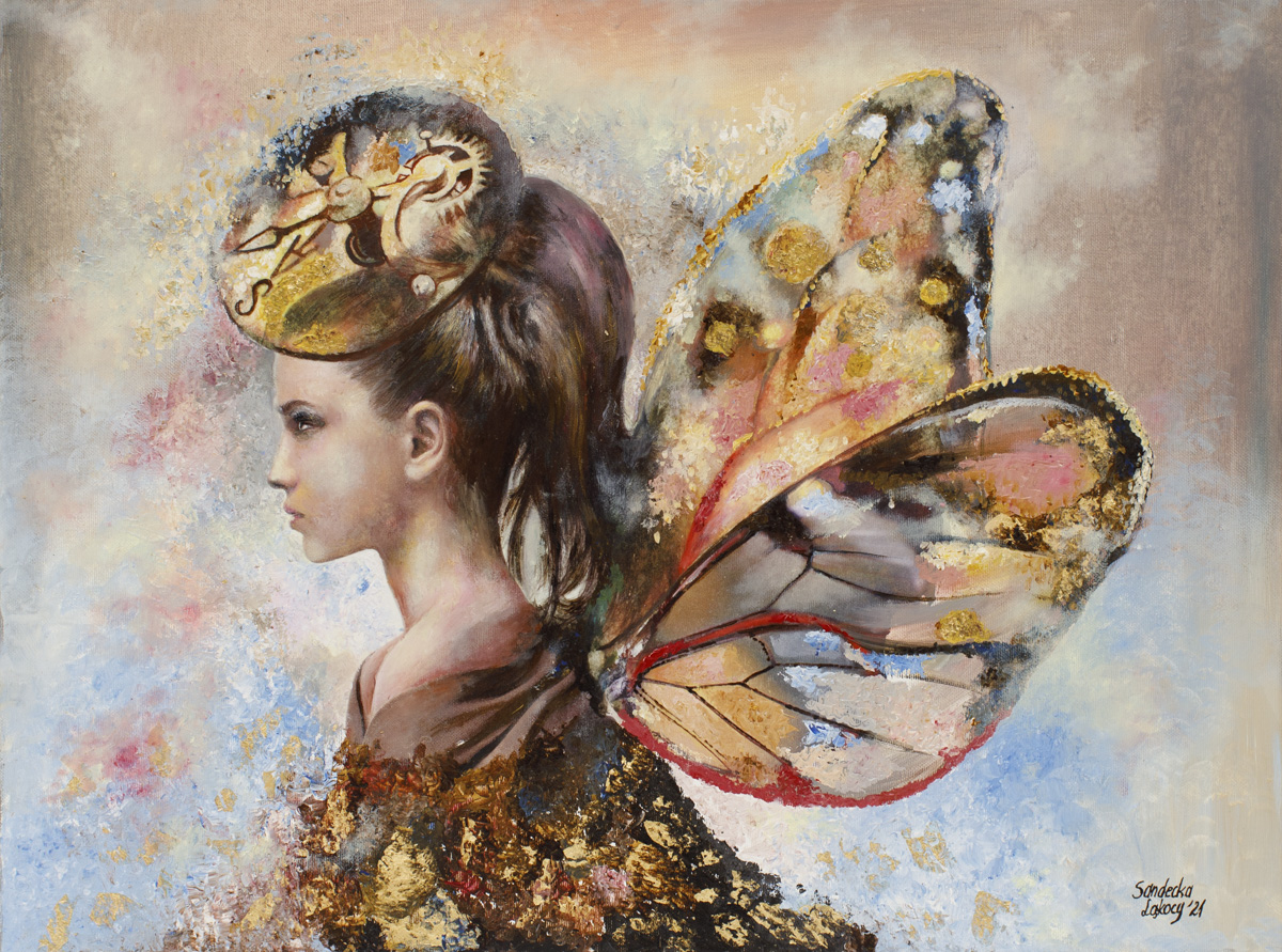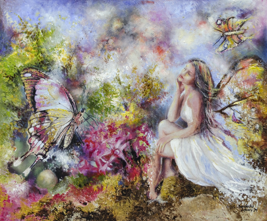 Kobieta w moim malarstwie odgrywa szczególną rolę. Delikatna ale jednocześnie silna, zazwyczaj w otoczeniu roślin, kwiatów ,zwierząt, motyli. Czasem gniewna, walcząca o swoje prawa I należne miejsce czy godność, czasem kochająca bez granic naturę, faunę czy florę.