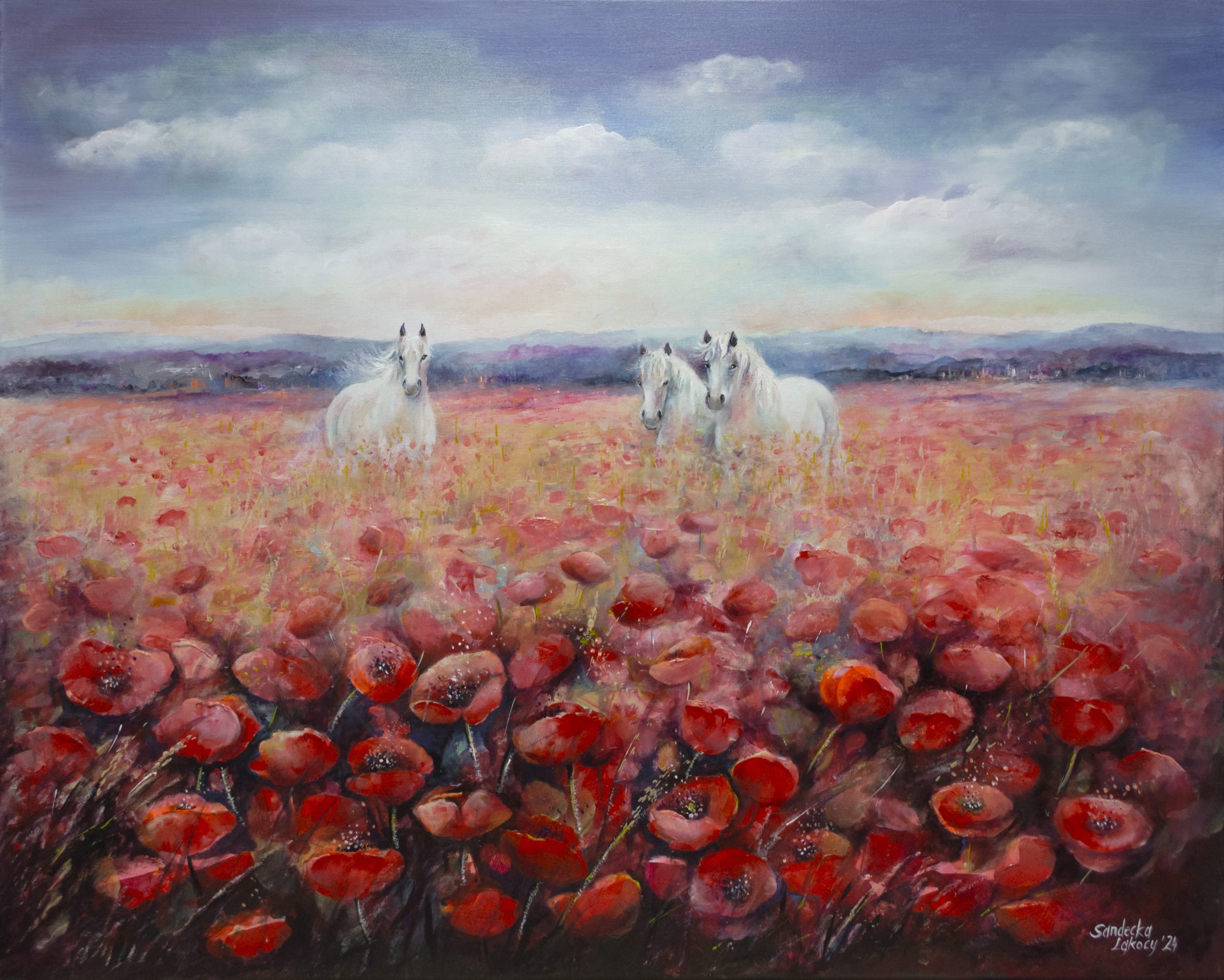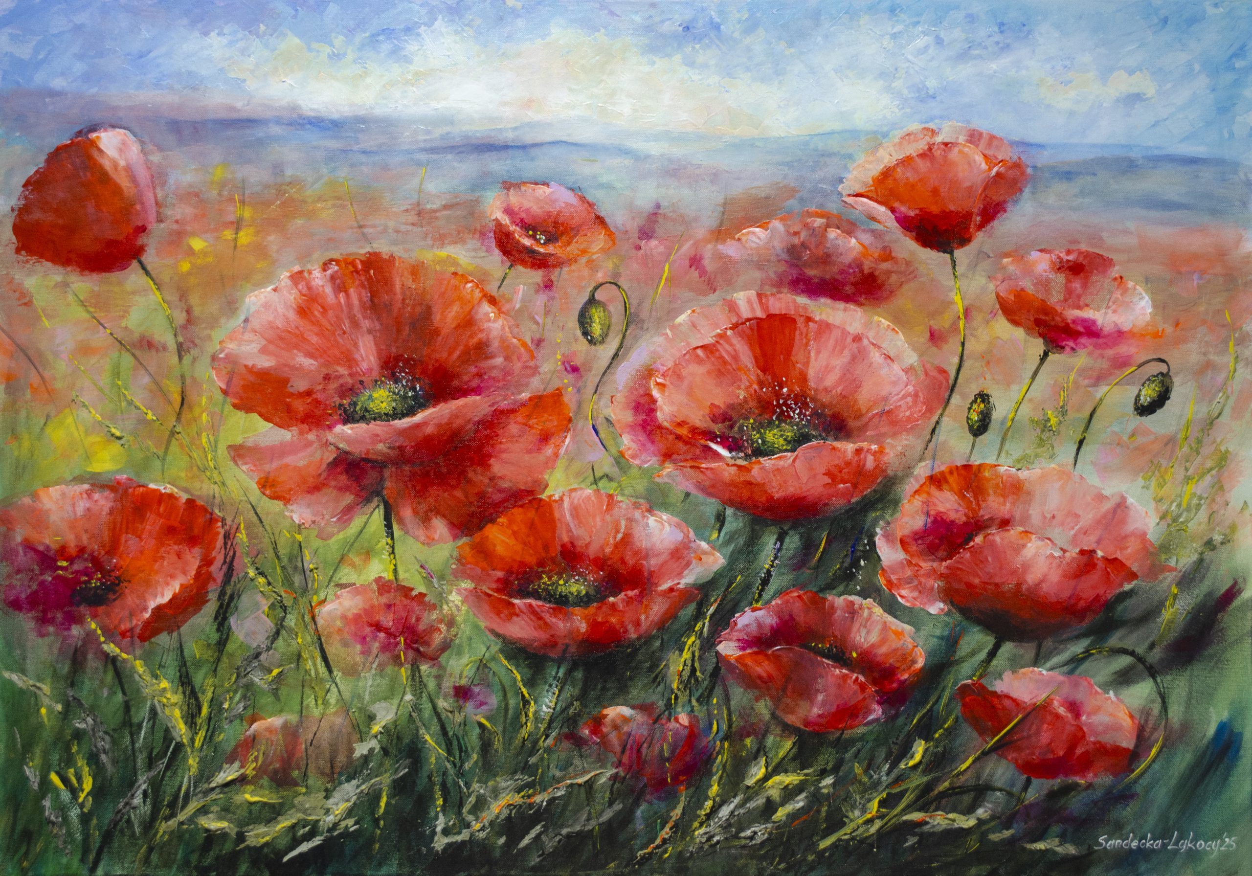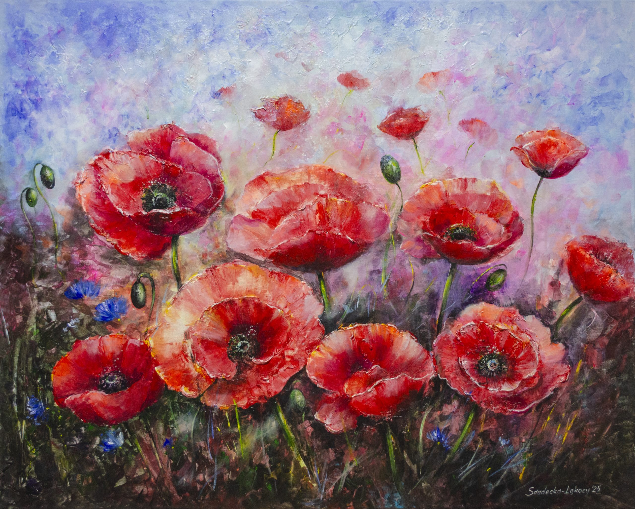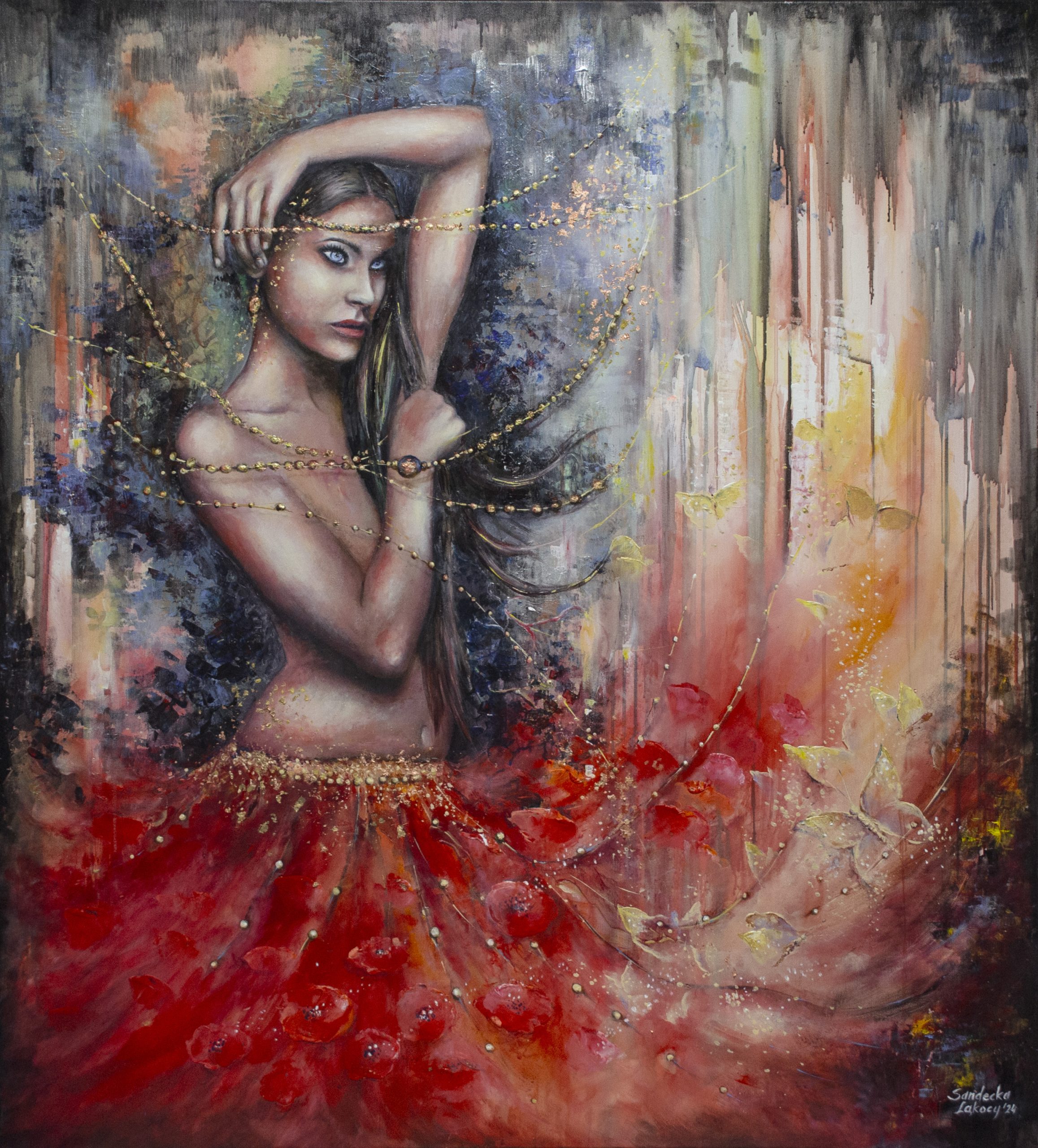Złoto I czerwień to ulubione kolory, wg. mnie niezwykle silnie działające w obrazie. Czerwień delikatnych maków przechodząca w czerwień kobiecej sukni, elementy złotej biżuterii to częste aspekty w moich obrazach. Są chwile gdy obraz niemal ‘sam się maluje’, moja reka tylko podąża za pędzlem, wtedy powstają najlepsze prace.