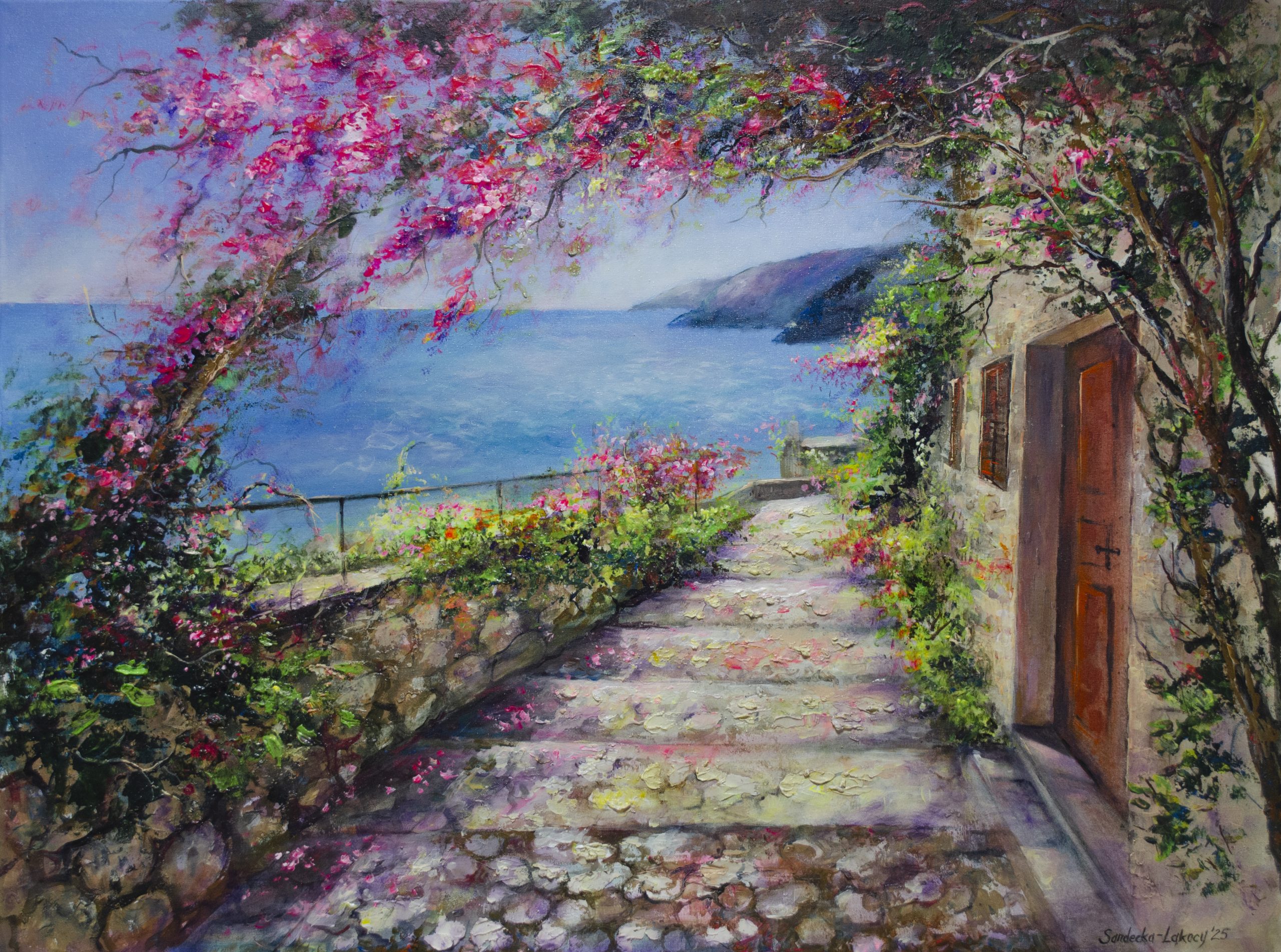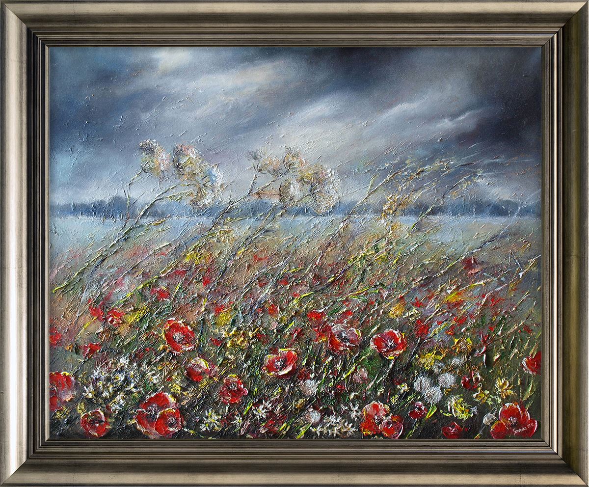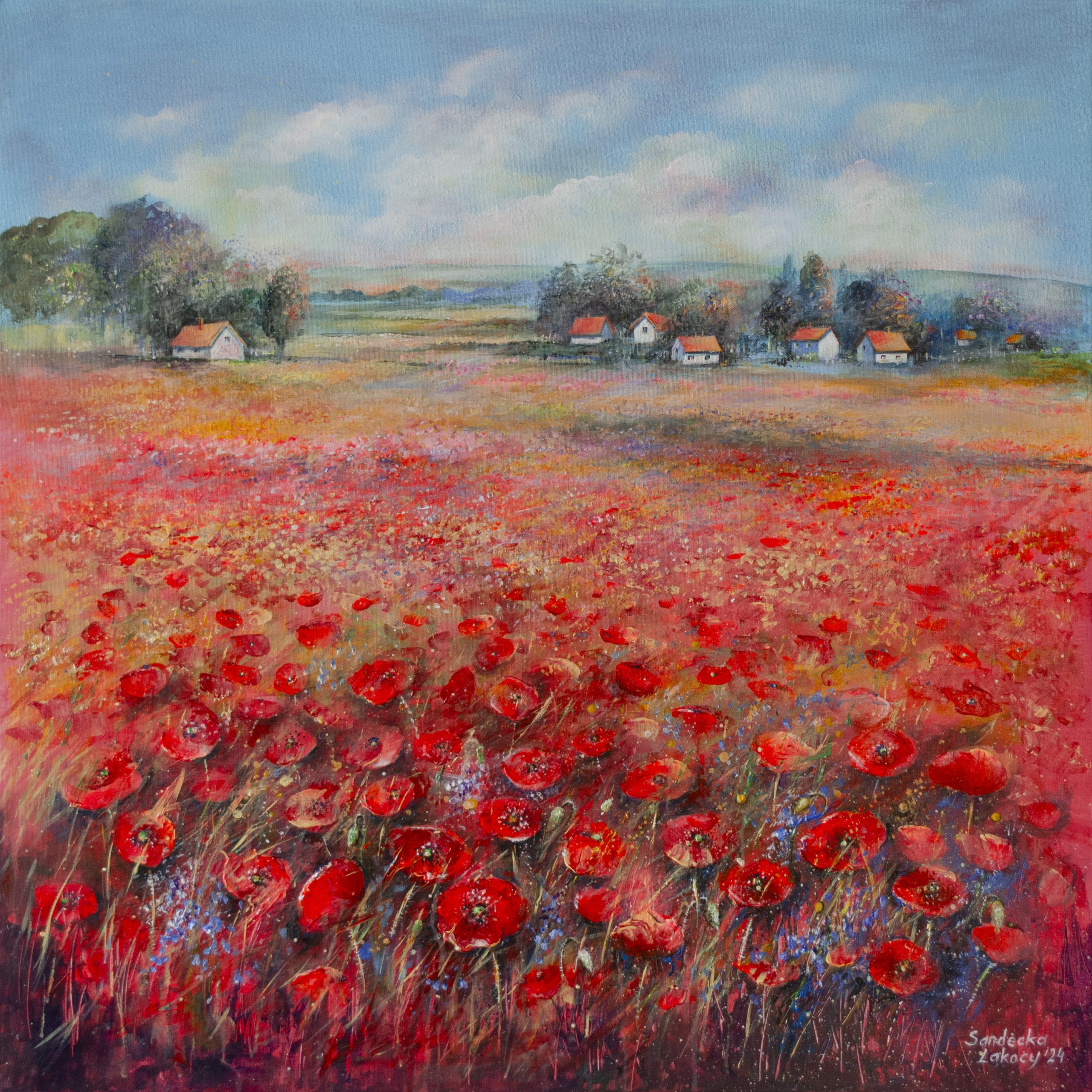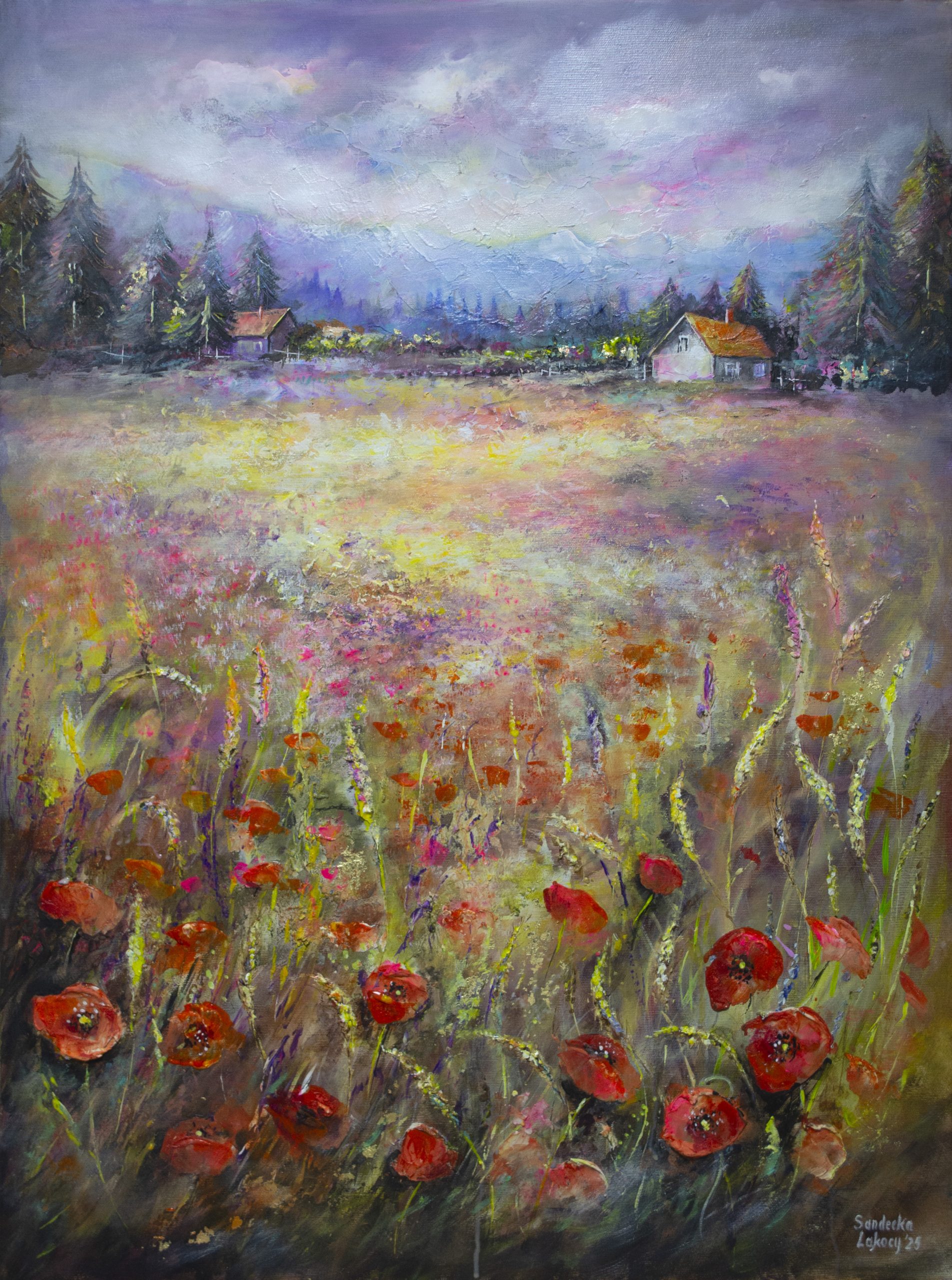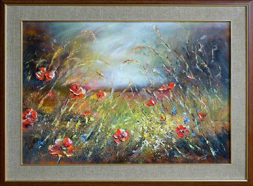 Złoto I czerwień to ulubione kolory, wg. mnie niezwykle silnie działające w obrazie. Czerwień delikatnych maków przechodząca w czerwień kobiecej sukni, elementy złotej biżuterii to częste aspekty w moich obrazach. Są chwile gdy obraz niemal ‘sam się maluje’, moja reka tylko podąża za pędzlem, wtedy powstają najlepsze prace.
